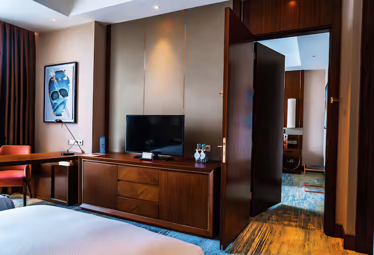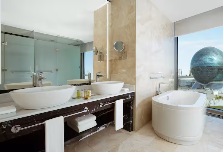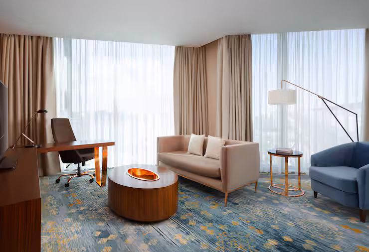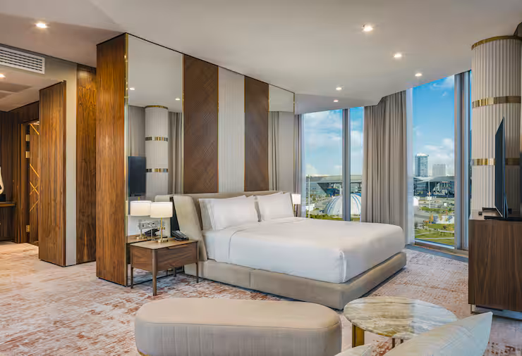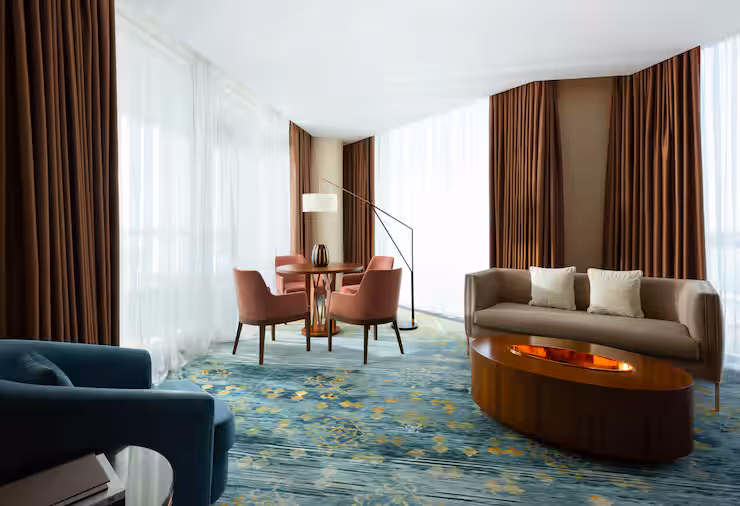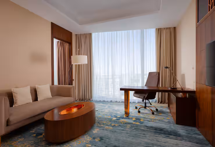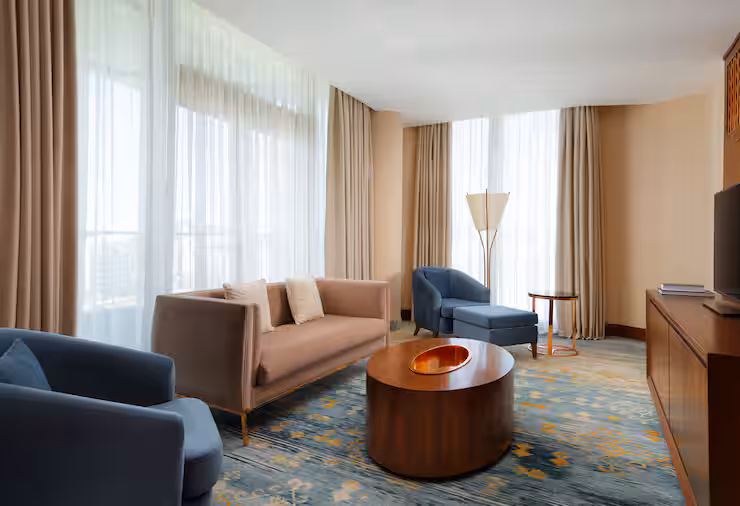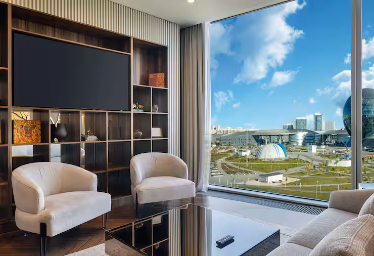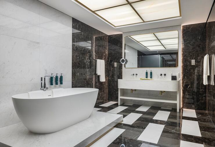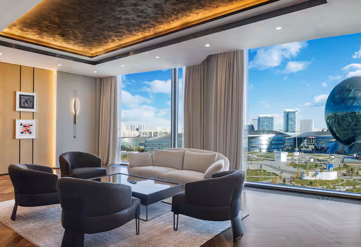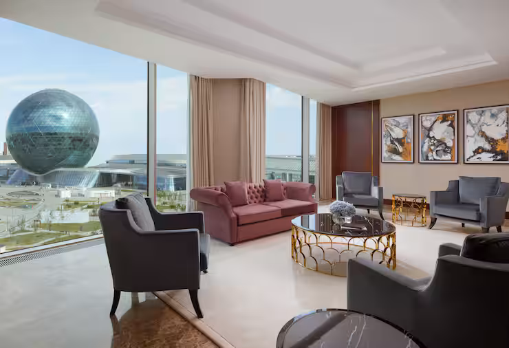 В номере: гостиная, столовая, кухня, кабинет, спальня; двуспальная кровать King Size, мягкая мебель, кондиционер, аудиосистема, 2 HD-телевизора, wi-fi, сейф, мини-бар; балкон. В ванной комнате: ванна, душ, фен, полотенца, туалетные принадлежности, халаты, тапочки.