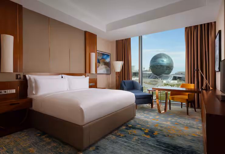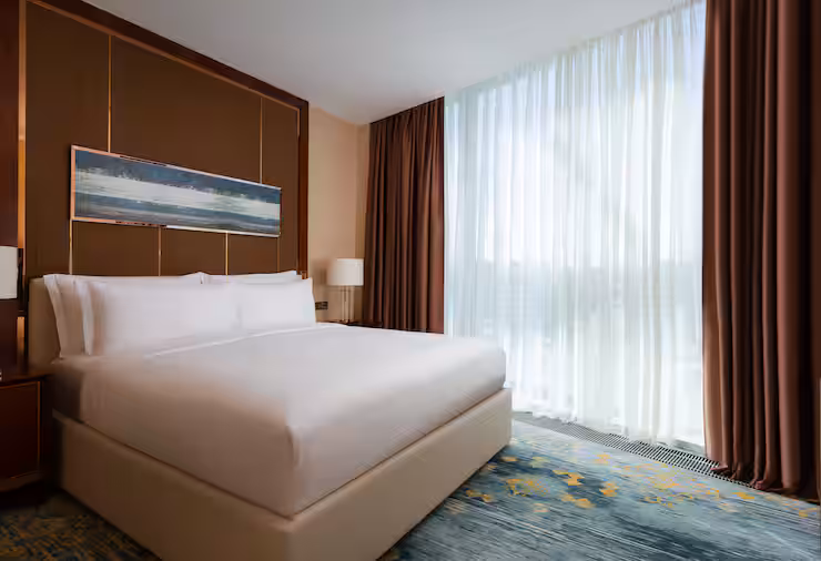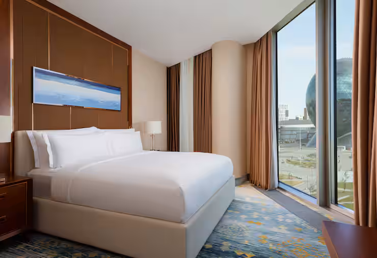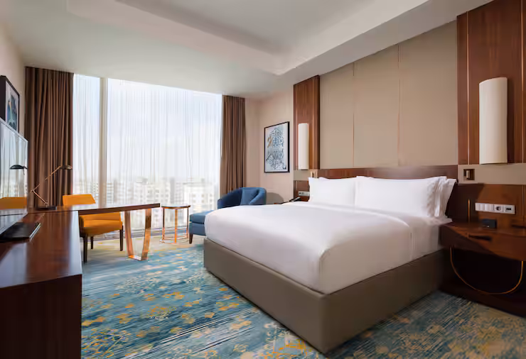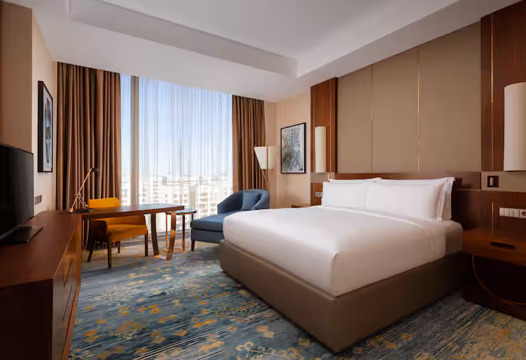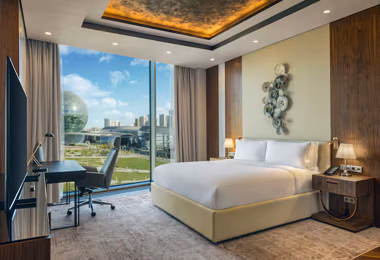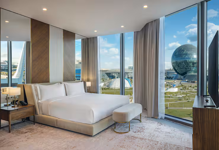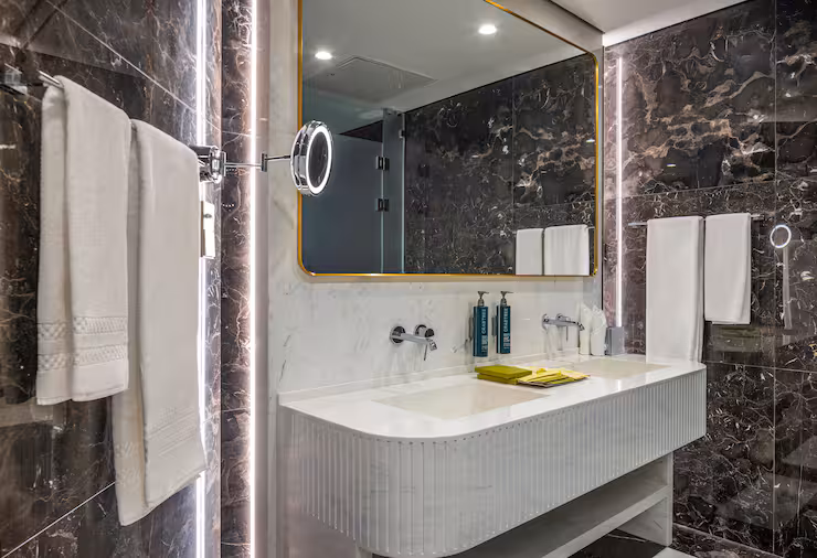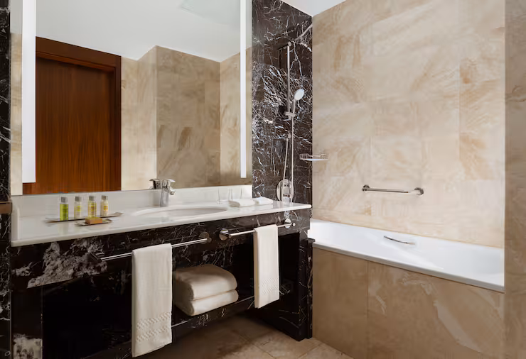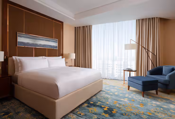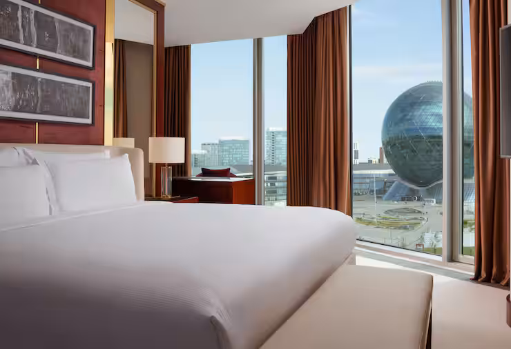 В номере: гостиная, столовая, кухня, кабинет, спальня; двуспальная кровать King Size, мягкая мебель, кондиционер, аудиосистема, 2 HD-телевизора, wi-fi, сейф, мини-бар; балкон. В ванной комнате: ванна, душ, фен, полотенца, туалетные принадлежности, халаты, тапочки.